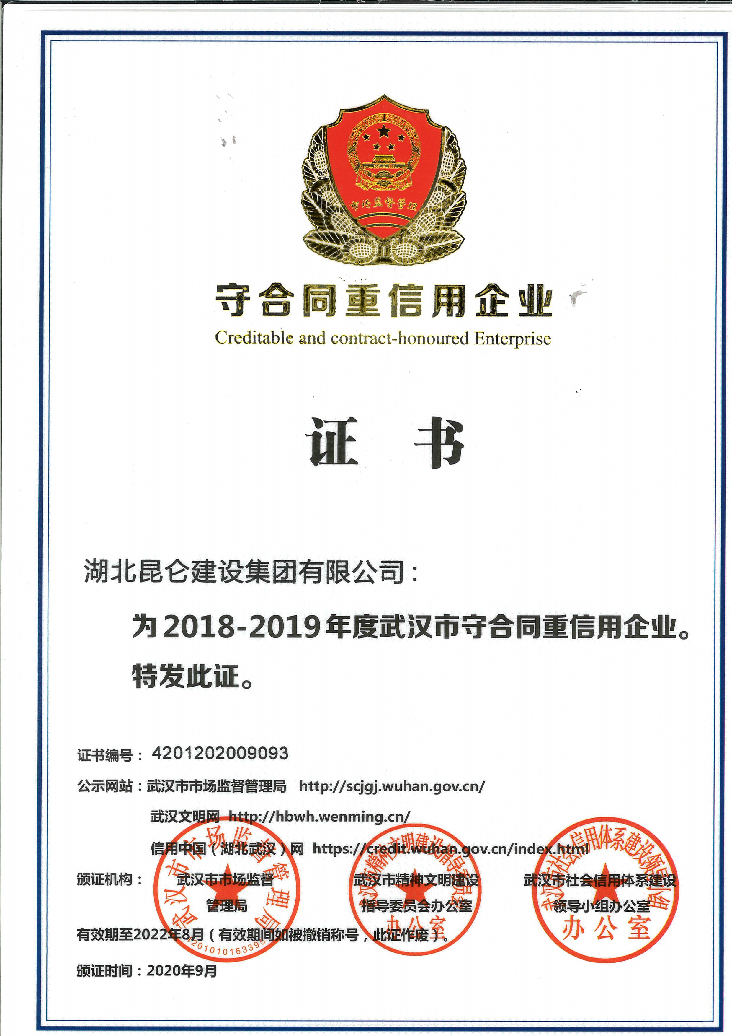 2018~2019年武漢市守合同重信用企業(yè)